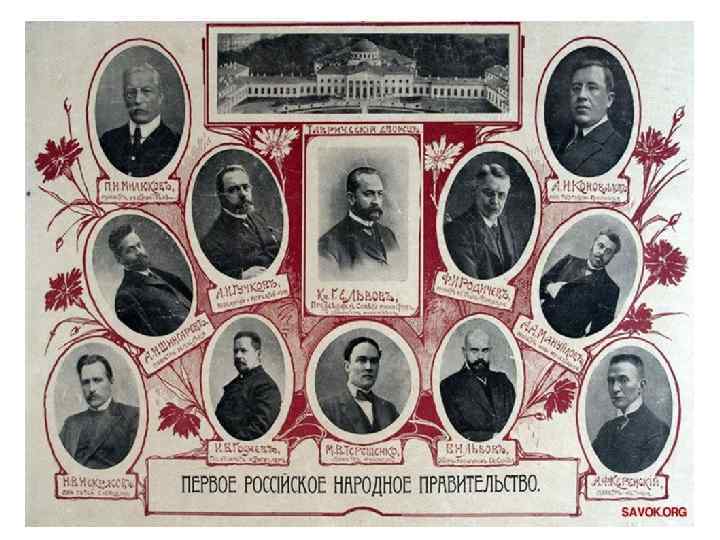 • Либералы из партии конституционных демократов, преобладавшие в первых двух составах кабинета министров, как и меньшевики и эсеры, составлявшие большинство в третьем составе, целиком принадлежали к городской культурной элите, к тем кругам интеллигенции, которые соединяли в себе наивную и слепую веру в «народ» и страх перед окружавшей их «тёмной массой» . • В большинстве своём они полагали (по крайней мере, в первые месяцы революции), что необходимо дать полную волю демократическому потоку, освобождённому сначала кризисом, а затем – падением старого режима.