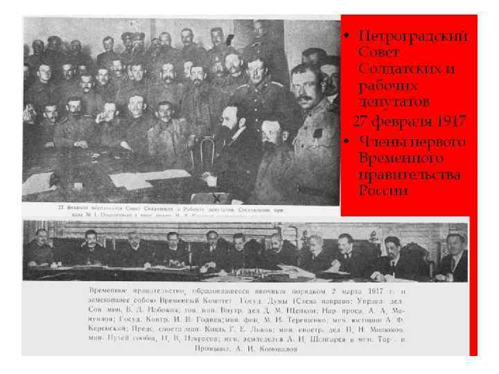 • Практически одновременно революционнодемократическими силами был сформирован параллельный орган власти — Петроградский Совет — что привело к ситуации, известной как двоевластие.