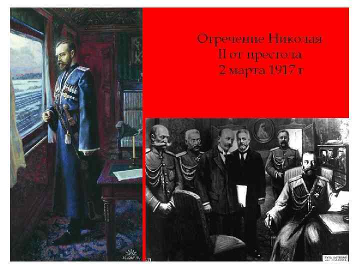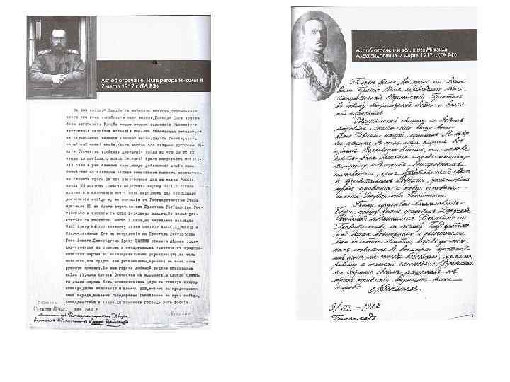 • Отречение произошло во Пскове в 23 часа 40 минут в штабном вагоне императорского поезда в присутствии эмиссаров Временного комитета А. И. Гучкова и В. В. Шульгина, а также генералов Н. В. Рузского, Ю. Н. Данилова, и С. С. Саввича. Революционным комендантом Петрограда стал генерал Лавр Корнилов, который 5 (18) марта возьмёт царскую семью под арест в Царском Селе. • Великий князь Михаил Александрович не рискнул вступить на престол, так как не располагал никакой реальной силой. Окончательно его колебания завершились после переговоров с представителями Госдумы во главе с Родзянко, прямо заявившими, что в случае принятия им престола в столице разразится новое восстание, и Дума не может гарантировать ему безопасность.