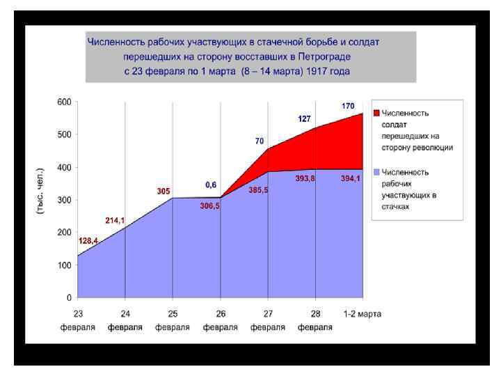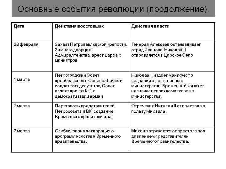 • 27 февраля (12 марта) 1917 года всеобщая забастовка переросла в вооруженное восстание; войска, перешедшие на сторону восставших, заняли важнейшие пункты города, правительственные здания. • В сложившейся обстановке царское правительство проявило неспособность к быстрым и решительным действиям. • Разрозненные и немногочисленные силы, сохранявшие ему верность, оказались не в состоянии самостоятельно справиться с анархией, охватившей столицу, а несколько частей, снятых с фронта для подавления восстания, не смогли пробиться к городу.