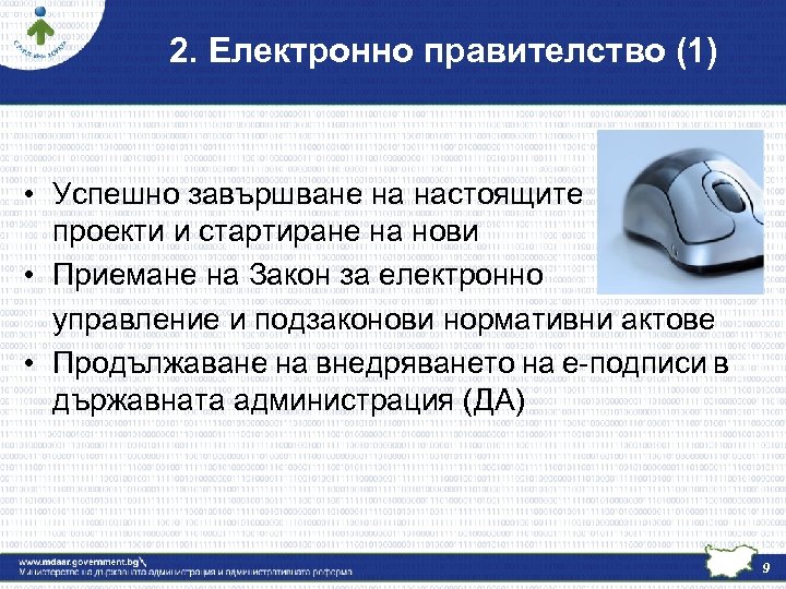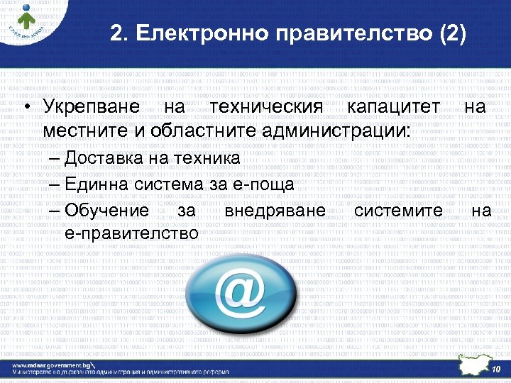 2. Електронно правителство (1) • Успешно завършване на настоящите проекти и стартиране на нови • Приемане на Закон за електронно управление и подзаконови нормативни актове • Продължаване на внедряването на е-подписи в държавната администрация (ДА) 9