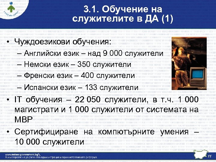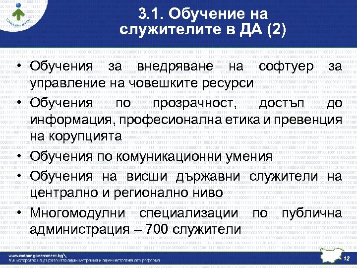 3. 1. Обучение на служителите в ДА (1) • Чуждоезикови обучения: – Английски език – над 9 000 служители – Немски език – 350 служители – Френски език – 400 служители – Испански език – 133 служители • IT обучения – 22 050 служители, в т. ч. 1 000 магистрати и 1 000 служители от системата на МВР • Сертифициране на компютърните умения – 10 000 служители 11