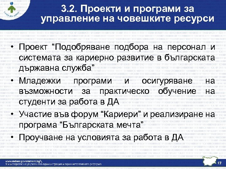 3. 1. Обучение на служителите в ДА (2) • Обучения за внедряване на софтуер за управление на човешките ресурси • Обучения по прозрачност, достъп до информация, професионална етика и превенция на корупцията • Обучения по комуникационни умения • Обучения на висши държавни служители на централно и регионално ниво • Многомодулни специализации по публична администрация – 700 служители 12