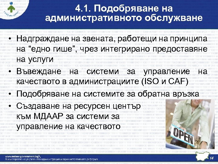 4. 1. Подобряване на административното обслужване • Надграждане на звената, работещи на принципа на “едно гише”, чрез интегрирано предоставяне на услуги • Въвеждане на системи за управление на качеството в администрациите (ISO и CAF) • Подобряване на системите за обратна връзка • Създаване на ресурсен център към МДААР за системи за управление на качеството 14