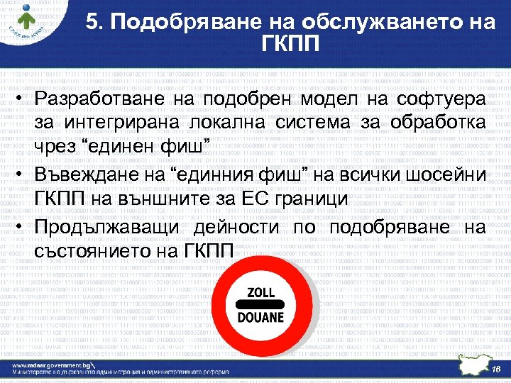5. Подобряване на обслужването на ГКПП • Разработване на подобрен модел на софтуера за интегрирана локална система за обработка чрез “единен фиш” • Въвеждане на “единния фиш” на всички шосейни ГКПП на външните за ЕС граници • Продължаващи дейности по подобряване на състоянието на ГКПП 16