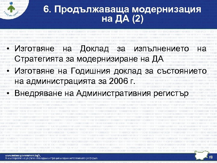 6. Продължаваща модернизация на ДА (1) • Организационно развитие тивните структури чрез: на администра- – Прилагане на принципите за добро управление – Реализиране на възможности за прехвърляне на дейности към частния сектор – аутсорсинг 17