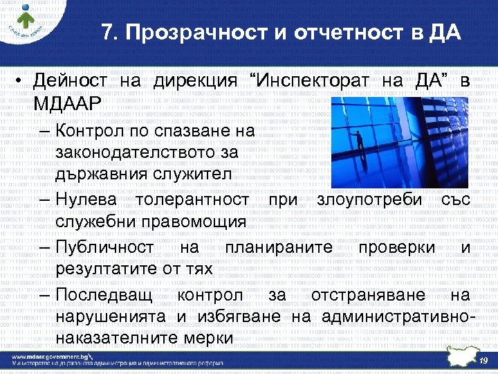 6. Продължаваща модернизация на ДА (2) • Изготвяне на Доклад за изпълнението на Стратегията за модернизиране на ДА • Изготвяне на Годишния доклад за състоянието на администрацията за 2006 г. • Внедряване на Административния регистър 18