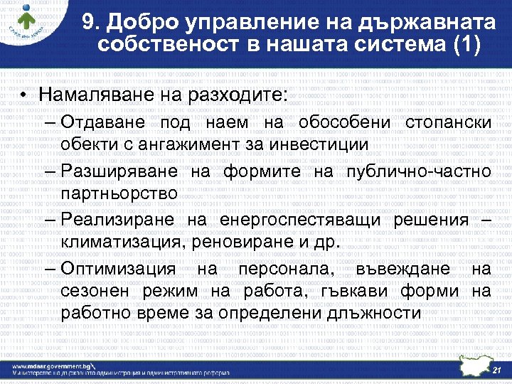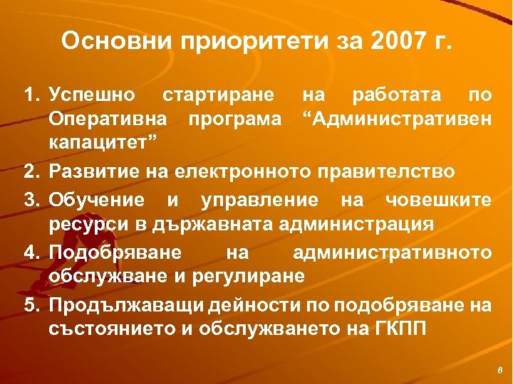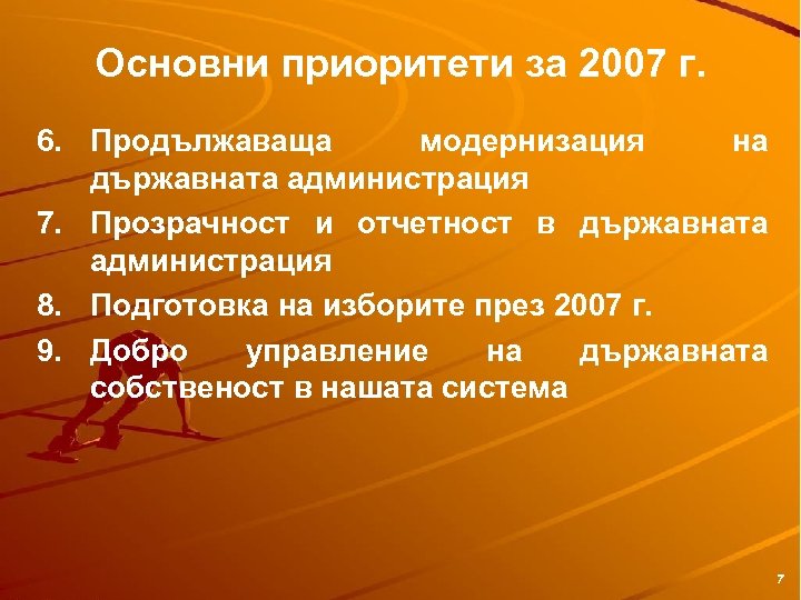 Основни приоритети за 2007 г. 6. Продължаваща модернизация на държавната администрация 7. Прозрачност и отчетност в държавната администрация 8. Подготовка на изборите през 2007 г. 9. Добро управление на държавната собственост в нашата система 7
