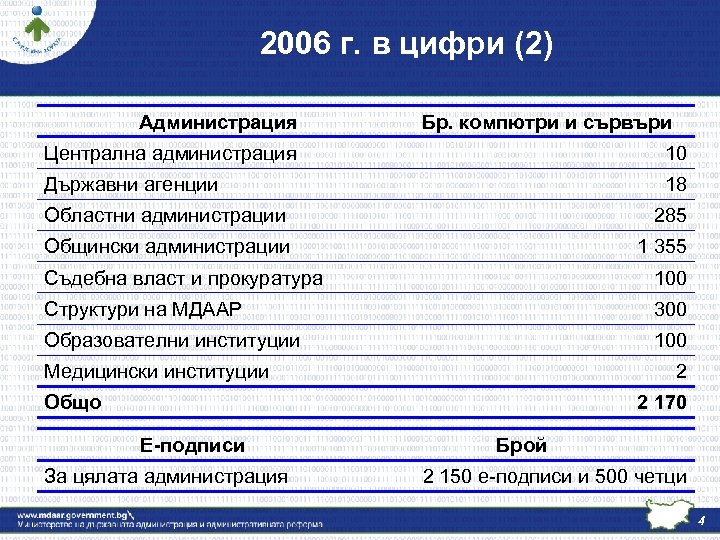 2006 г. в цифри (2) Администрация Бр. компютри и сървъри Централна администрация 10 Държавни агенции 18 Областни администрации 285 Общински администрации 1 355 Съдебна власт и прокуратура 100 Структури на МДААР 300 Образователни институции 100 Медицински институции 2 Общо 2 170 Е-подписи За цялата администрация Брой 2 150 е-подписи и 500 четци 4