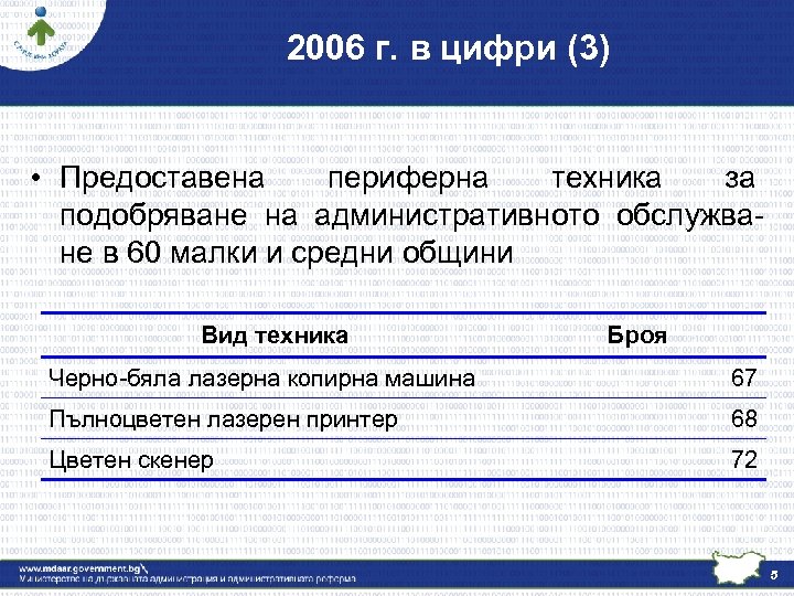 2006 г. в цифри (3) • Предоставена периферна техника за подобряване на административното обслужване в 60 малки и средни общини Вид техника Броя Черно-бяла лазерна копирна машина 67 Пълноцветен лазерен принтер 68 Цветен скенер 72 5