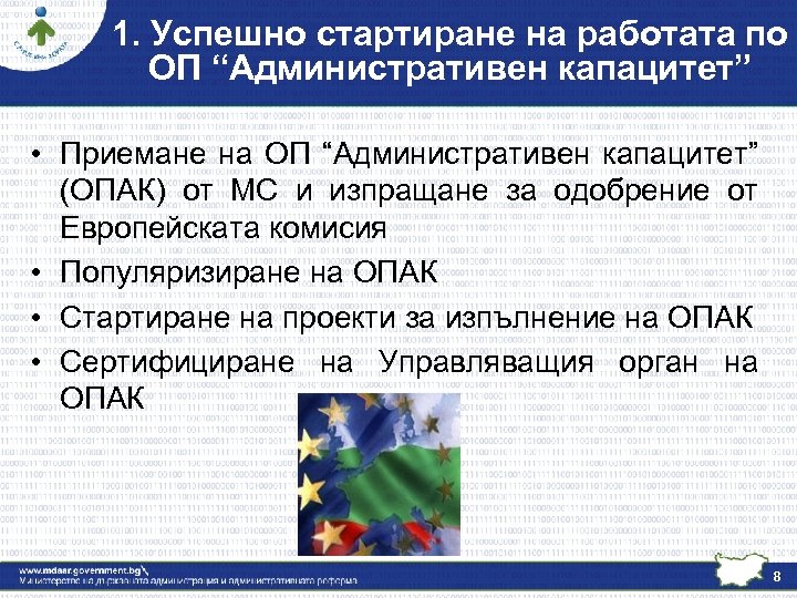 1. Успешно стартиране на работата по ОП “Административен капацитет” • Приемане на ОП “Административен капацитет” (ОПАК) от МС и изпращане за одобрение от Европейската комисия • Популяризиране на ОПАК • Стартиране на проекти за изпълнение на ОПАК • Сертифициране на Управляващия орган на ОПАК 8