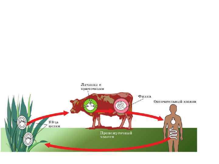 • Цикл развития бычьего цепня включает смену двух хозяев: промежуточного - крупного рогатого скота и основного – человека.