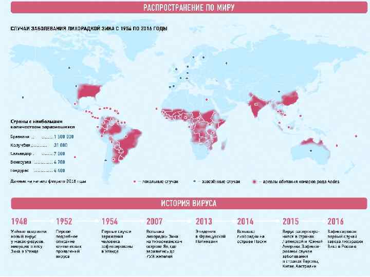 Вирус Зика — инфекция, которую разносят комары Aedes aegypti, или так называемый египетский комар. В начале 50 -х годов прошлого века это заболевание было впервые зафиксировано у человека. Однако никакой паники в медицинском сообществе не возникло, так как за 60 лет было всего 15 пострадавших. Первая крупная вспышка инфекции произошла в 2007 году на острове Яп в Тихом океане, в 2013 — во Французской Полинезии, а в 2015 году — в Бразилии. Свое название вирус получил в честь леса Зика в Уганде, где он и был впервые обнаружен. На территории Бразилии уже более 1 миллиона заболевших, а с октября там было зафиксировано 4 тысячи новорожденных с микроцефалией. Еще 20 тысяч человек заражены в Колумбии. Все больше больных появляется в Венесуэле, Мексике и Гватемале. В общей сложности инфекция проникла как минимум в 23 страны и вышла за пределы Латинской Америки. Вспышки уже были зарегистрированы в Азии и Африке, сообщалось о заболевших в США и Европе.
