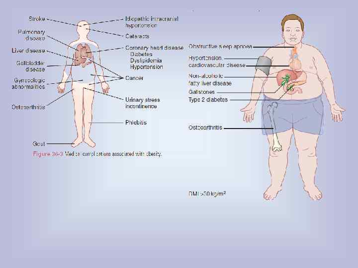 • Сердечно-сосудистая система: артериальная гипертензия, ИБС и ее осложнения, атерогенная дислипидемия, гиперкоагуляция, сердечная недостаточность. • СД-2 с его поздними осложнениями и нарушение толерантности к углеводам. • Синдром ночного апноэ (Пиквика), легочное сердце. • Пищеварительная система: желчнокаменная болезнь, опущение • желудка, хронические запоры. Половая система: у женщин - типично формирование синдрома поликистозных яичников, у мужчин - нормогонадотропный гипогонадизм. Мочевыводящая система: гиперурикемия, мочекаменная болезнь. • • Трофические язвы ног, остеоартроз тазобедренных, коленных и голеностопных суставов. • Нервная система: апатия, сонливость, быстрая утомляемость. • Ожирение нередко сопровождается депрессивными расстройствами, тревогой, нарушениями межличностных и социальных контактов. Повышенный риск развития онкологической патологии (рак молочной железы и эндометрия у женщин, толстой кишки у мужчин)