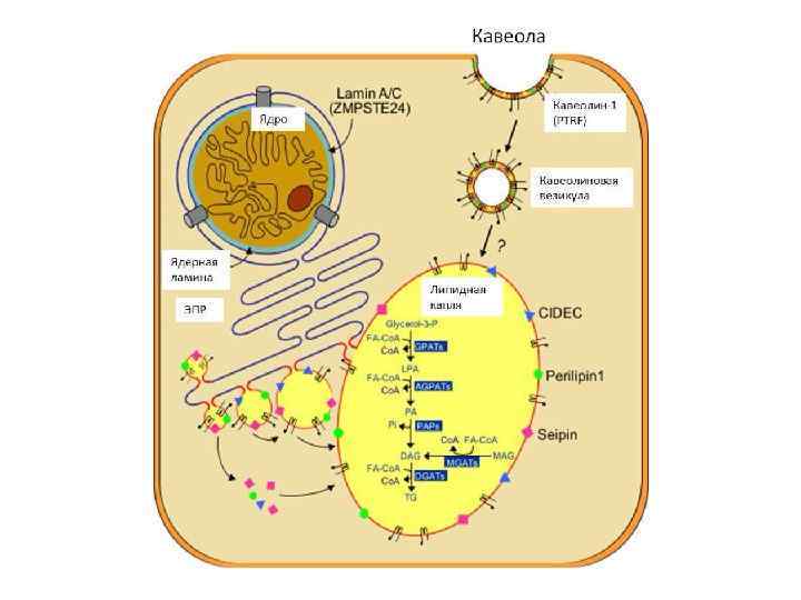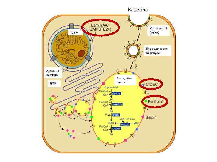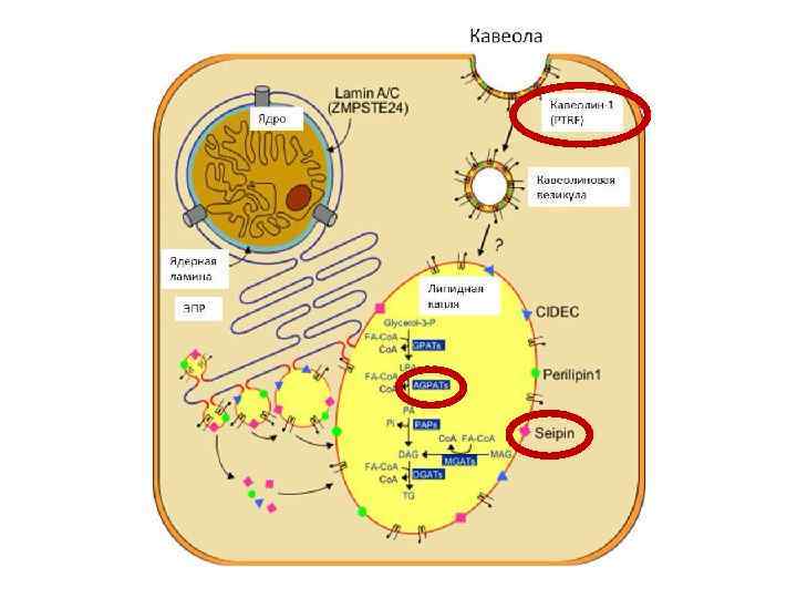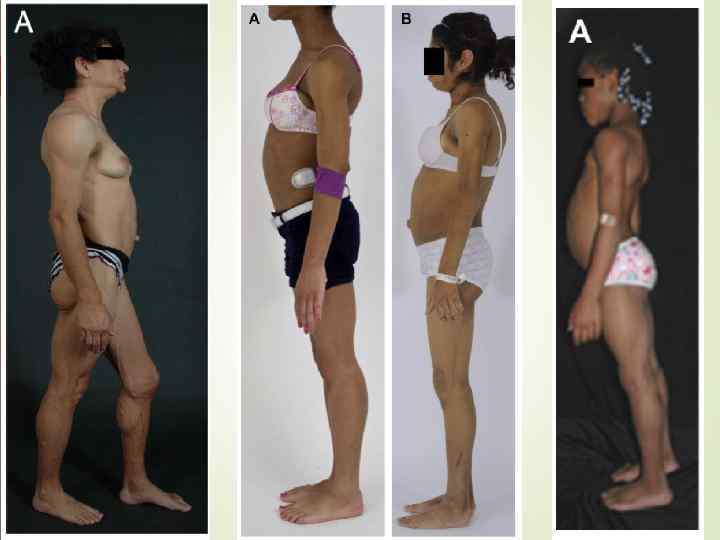 Тип Мутация Механизм наследования Клинические особенности Тип 1 неизвестно неизвестен Потеря ПЖК конечностей Тип 2 LMNA – ламины А и. С Аутосомнодоминантный, описано около 300 случаев Потеря ПЖК конечностей и туловища (кроме шеи и лица) Тип 3 PPARG - PPARγ Аутосомнодоминантный, описано около 30 случаев Потеря ПЖК конечностей, особенно в дистальных отделах Тип 4 PLIN 1 – перелипин 1 Аутосомнодоминантный, описано 6 случаев Потеря ПЖК конечностей, мелкие адипоциты и усиленный фиброз ЖТ Тип 5 CIDEC – эффетор С Аутосомнорецессивный, 1 случай Потеря ПЖК конечностей, многокамерные мелкие липидные капли в адипоцитах Тип 6 LIPE – гормончувствительная липаза Аутосомнорецессивный, 6 случаев Перерапределение ПЖК, метаболические нарушения, дистрофия мышц Тип 7 AKT 2 – протеинкиназа В Аутосомно. Потеря ПЖК конечностей доминантный, 4 пациента из 1 семьи