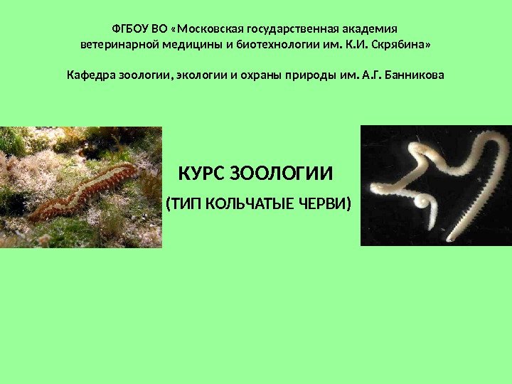 ФГБОУ ВО «Московская государственная академия ветеринарной медицины и биотехнологии им. К. И. Скрябина» Кафедра зоологии, экологии и охраны природы им. А. Г. Банникова КУРС ЗООЛОГИИ (ТИП КОЛЬЧАТЫЕ ЧЕРВИ)