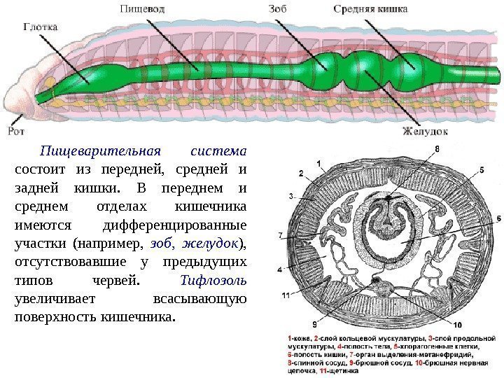 Пищеварительная система состоит из передней, средней и задней кишки. В переднем и среднем отделах кишечника имеются дифференцированные участки (например, зоб, желудок ), отсутствовавшие у предыдущих типов червей. Тифлозоль увеличивает всасывающую поверхность кишечника.