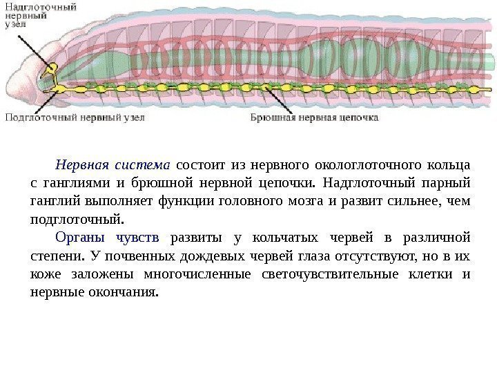 • У большинства видов кровеносная система замкнутая, основу её составляют спинной и брюшной сосуды, соединённые кольцевыми сосудами, которые напоминают артерии и вены. Сердца нет, его роль выполняют участки спинного и циркулярных сосудов, содержащие сократительные элементы. • Дыхание кожное, у морских видов — с помощью жабр на параподиях. • Органы выделения — парные метанефридии в каждом сегменте. • Нервная система слагается из крупного ганглия — головного мозга, от которого отходит брюшная нервная цепочка. В каждом сегменте имеется свой нервный узел. • Органы чувств наиболее развиты у многощетинковых червей и представлены: на голове — глазами, органами осязания и химического чувства; на теле — чувствительными клетками.