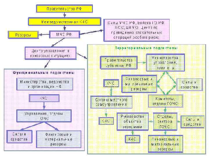 Территориальная подсистема РСЧС предназначена для предупреждения и ликвидации ЧС на подведомственной территории. Главный руководящий орган – комиссия по ЧС (КЧС) по защите населения и территорий. Рабочими органами территориальных КЧС являются штабы по делам ГО и ЧС и ликвидации последствий стихийных бедствий.