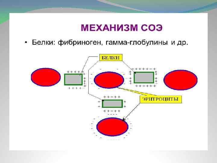 Повышение СОЭ-скорость оседания эритроцитов Причина: Изменение ряда физико-химических свойств клеток крови и плазмы -изменение заряда эритроцитов(увеличение глобулинов, белков острой фазы)