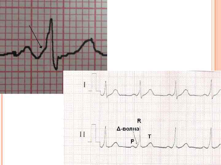 ЭКГ-ПРИЗНАКИ WPW-СИНДРОМА Укорочение интервала P-Q В начале комплекса QRS дополнительная дельта-волна возбуждения Увеличение продолжительности и небольшая деформация комплекса QRS Дискордантное комплексу QRS смещение сегмета S-T и изменение полярности зубца Т ( непостоянные признаки)