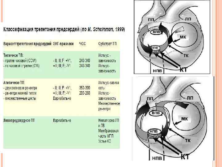 ТРЕПЕТАНИЕ ПРЕДСЕРДИЙ Трепетание предсердий (ТП) относится к предсердным тахикардиям, обусловленным циркуляцией волны возбуждения по топографически обширному контуру (т. н. «макро-риэнтри» ), как правило, вокруг крупных анатомических структур в правом или левом предсердии. Клиника Сердцебиение Одышка Головокружение Частый, правильный пульс (при постоянном коэффициенте проведения)