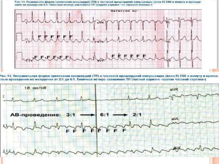 ЭКГ-ПРИЗНАКИ ТРЕПЕТАНИЯ ПРЕДСЕРДИЙ Частые до 200 -400 в минуту, регулярные, пилообразные похожие друг на друга предсердные волны F в отведениях II, III, a. VF, V 1 -2; Нормальные неизмененные желудочковые комплексы, каждому из которых предшествует определённое количество предсердных волн F Регулярный желудочковый ритм с одинаковыми интервалами R-R (может временно терять регулярность при изменении атриовентрикулярной проводимости – при атипичной неправильной форме)