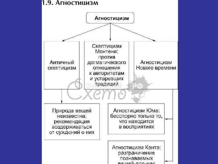 Агностицизм Представитель - И. Кант 1) Учение о феномене и ноумене. • То, что входит в познавательные возможности человеческого разума, все равно не будет никогда познано, поскольку разум может лишь познать отображение вещи в чувственных ощущениях, но никогда не познает внутреннюю сущность данной вещи — "вещи в себе". 2) Учение об антиномиях разума. • Бог существует /Бога не существует