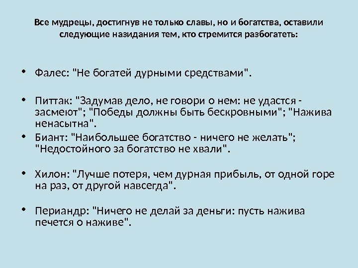 Все мудрецы, достигнув не только славы, но и богатства, оставили следующие назидания тем, кто стремится разбогатеть: • Фалес: «Не богатей дурными средствами». • Питтак: «Задумав дело, не говори о нем: не удастся — засмеют»; «Победы должны быть бескровными»; «Нажива ненасытна». • Биант: «Наибольшее богатство — ничего не желать»; «Недостойного за богатство не хвали». • Хилон: «Лучше потеря, чем дурная прибыль, от одной горе на раз, от другой навсегда». • Периандр: «Ничего не делай за деньги: пусть нажива печется о наживе».