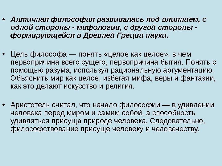• Античная философия развивалась под влиянием, с одной стороны — мифологии, с другой стороны — формирующейся в Древней Греции науки. • Цель философа — понять «целое как целое» , в чем первопричина всего сущего, первопричина бытия. Понять с помощью разума, используя рациональную аргументацию. Объяснить мир как целое, избегая мифа, веры и фантазии, как это делают искусство и религия. • Аристотель считал, что начало философии — в удивлении человека перед миром и самим собой, а способность удивляться присуща природе человека. Следовательно, философствование присуще человеку и человечеству.