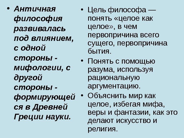 • Античная философия развивалась под влиянием, с одной стороны — мифологии, с другой стороны — формирующей ся в Древней Греции науки. • Цель философа — понять «целое как целое» , в чем первопричина всего сущего, первопричина бытия. • Понять с помощью разума, используя рациональную аргументацию. • Объяснить мир как целое, избегая мифа, веры и фантазии, как это делают искусство и религия.