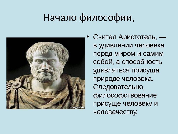 Начало философии, • Считал Аристотель, — в удивлении человека перед миром и самим собой, а способность удивляться присуща природе человека. Следовательно, философствование присуще человеку и человечеству.