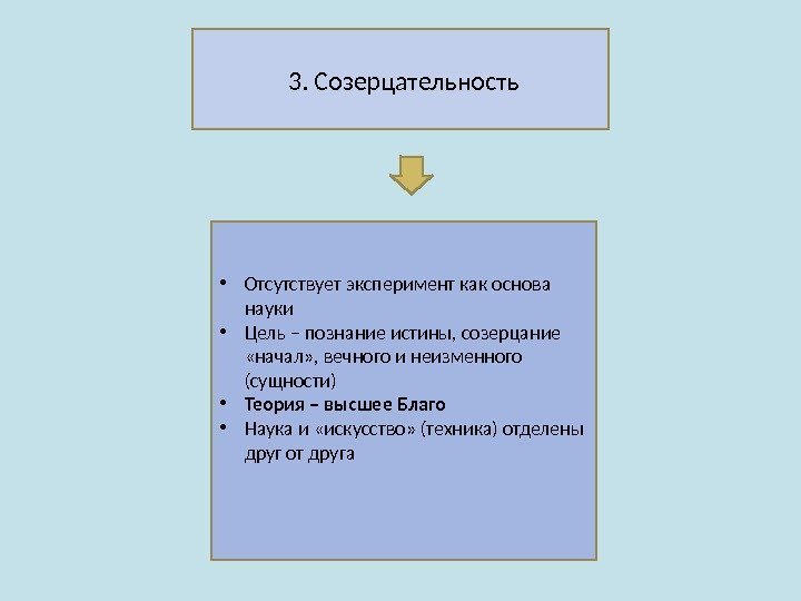 3. Созерцательность • Отсутствует эксперимент как основа науки • Цель – познание истины, созерцание «начал» , вечного и неизменного (сущности) • Теория – высшее Благо • Наука и «искусство» (техника) отделены друг от друга