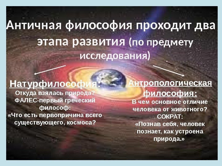 Античная философия проходит два этапа развития (по предмету исследования) Натурфилософия : Откуда взялась природа? ФАЛЕС-первый греческий философ: «Что есть первопричина всего существующего, космоса? Антропологическая философия: В чем основное отличие человека от животного? СОКРАТ: «Познав себя, человек познает, как устроена природа. »