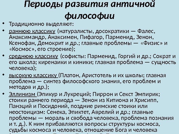 Периоды развития античной философии • Традиционно выделяют: • раннюю классику (натуралисты, досократики — Фалес, Анаксимандр, Анаксимен, Пифагор, Парменид, Зенон, Ксенофан, Демокрит и др. ; главные проблемы — «Физис» и «Космос» , его строение); • среднюю классику (софисты: Парменид, Горгий и др. ; Сократ и его школа; киренаики и киники; главная проблема — сущность человека); • высокую классику (Платон, Аристотель и их школы; главная проблема — синтез философского знания, его проблем и методов и др. ); • Эллинизм (Эпикур и Лукреций; Пиррон и Секст Эмпирик; стоики раннего периода — Зенон из Китиона и Хрисипп, Панэций и Посидоний, поздние римские стоики или неостоицизм: Сенека, Эпиктет, Аврелий и др. ; главные проблемы — мораль и свобода человека, проблема познания и т. д. ). К ним прибавляются вопросы структуры космоса, судьбы космоса и человека, отношение Бога и человека (неоплатоники — Плотин, Порфирий, Прокл, Филон Александрийский).