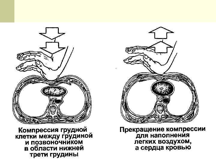 Закрытый массаж сердца Глубина компрессии – не менее 5 см; создаем искусственную систолу и диастолу