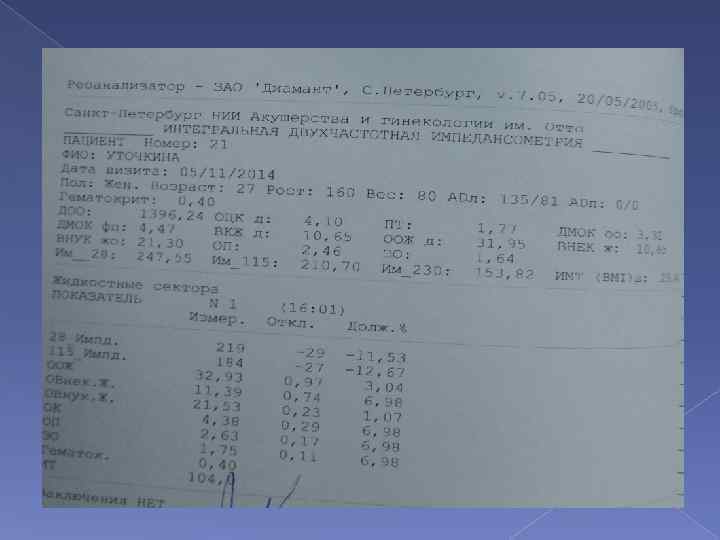 Беременная У. Ю. А. 27 лет. , поступила в НИИАГ 28. 10. 14 на дородовое отделение, для дообследования. Жалобы при поступлении: на постоянные, боли внизу живота, отеки голеней и кистей рук. Диагноз при поступлении: Беременность 34/35 недель; сахарный диабет беременных (СДБ); множественные, двусторонние кисты яичников; многоводье трофобластическая болезнь, пузырный занос (? ) (на основании данных УЗИ (от 15. 10. 14) и уровня хорионического гонадотропина человека, - 266 600 м. МЕ/мл, при норме для данного срока беременности 2 700 – 78 100 м. МЕ/мл).