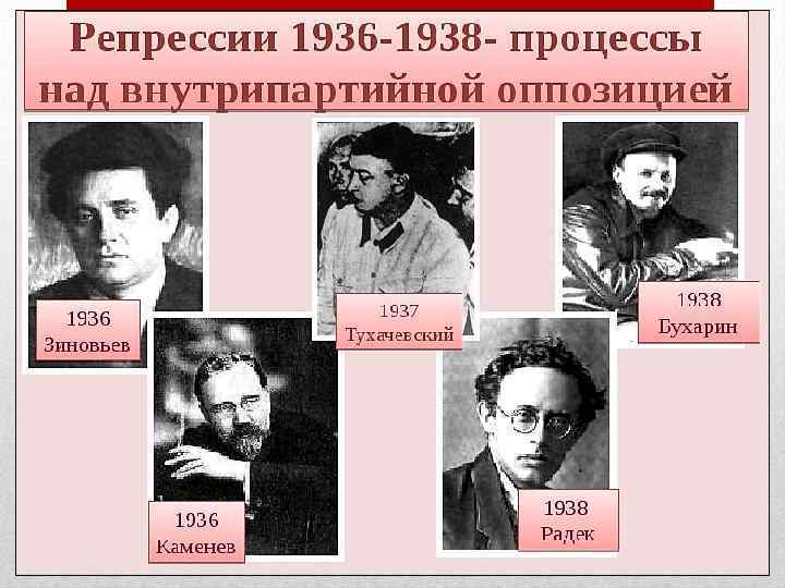 Массовые репрессии q Сталинские репрессии – массовые политические репрессии, осуществлявшиеся в СССР в период сталинизма (конец 1920 х – начало 1950 х годов). q «Большой террор» термин современной историографии, характеризующий период наиболее массовых сталинских репрессий и политических преследований в СССР 1937 1938 годов. q Убийство С. М. Кирова произошло в Ленинграде 1 декабря 1934 г. , оно послужило предлогом для новой волны политических репрессий. В основном репрессии затронули Москву и Ленинград, события в Ленинграде получили название «Кировский поток» , основным московским процессом этого времени стало «Кремлёвское дело» .