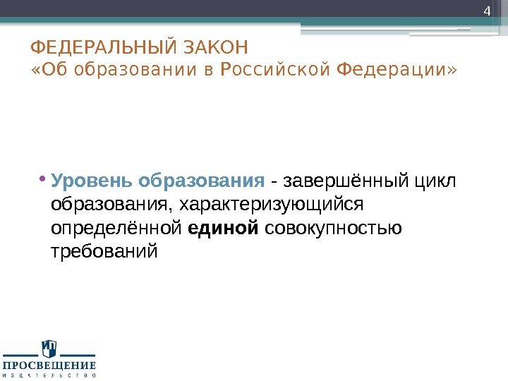 ФЕДЕРАЛЬНЫЙ ЗАКОН «Об образовании в Российской Федерации» • Уровень образования — завершённый цикл образования, характеризующийся определённой единой совокупностью требований