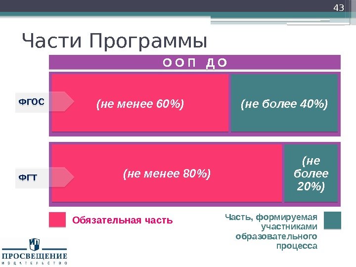 Части Программы О О П Д О (не менее 60%) (не более 40%)ФГОС 43 Обязательная часть Часть, формируемая участниками образовательного процесса(не менее 80%) (не более 20%)ФГТ