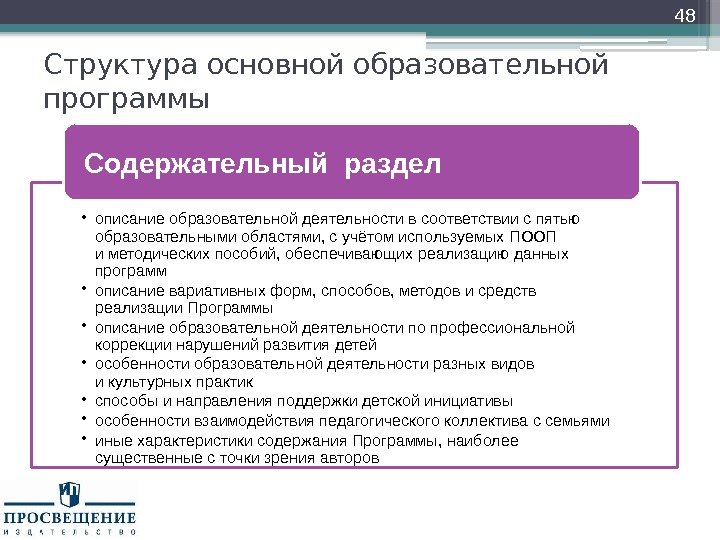 Структура основной образовательной программы 48 • описание образовательной деятельности в соответствии с пятью образовательными областями, с учётом используемых ПООП и методических пособий, обеспечивающих реализацию данных программ • описание вариативных форм, способов, методов и средств реализации Программы • описание образовательной деятельности по профессиональной коррекции нарушений развития детей • особенности образовательной деятельности разных видов и культурных практик • способы и направления поддержки детской инициативы • особенности взаимодействия педагогического коллектива с семьями • иные характеристики содержания Программы, наиболее существенные с точки зрения авторов. Содержательный раздел