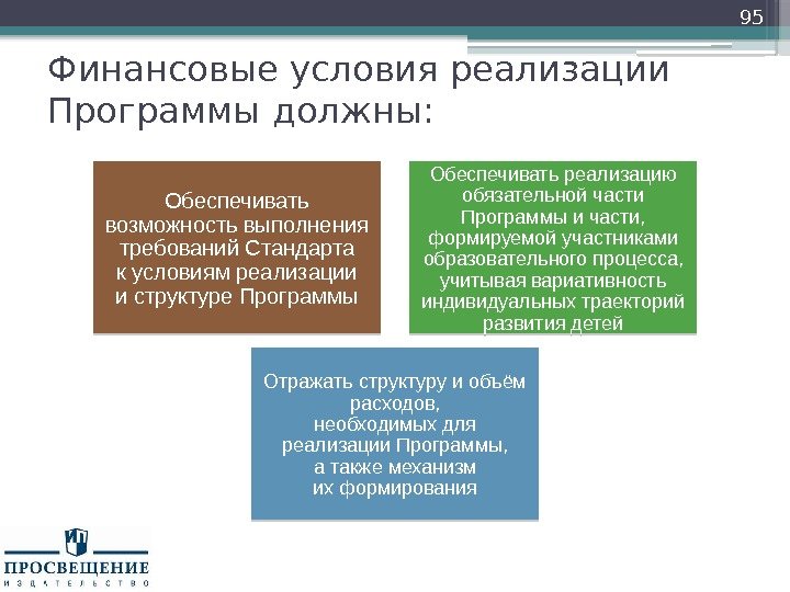 Финансовые условия реализации Программы должны: 95 Обеспечивать возможность выполнения требований Стандарта к условиям реализации и структуре Программы Обеспечивать реализацию обязательной части Программы и части, формируемой участниками образовательного процесса, учитывая вариативность индивидуальных траекторий развития детей Отражать структуру и объём расходов, необходимых для реализации Программы, а также механизм их формирования