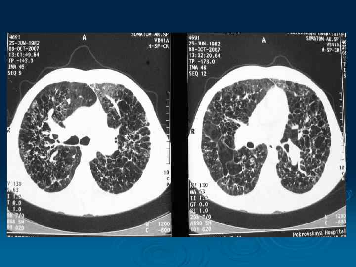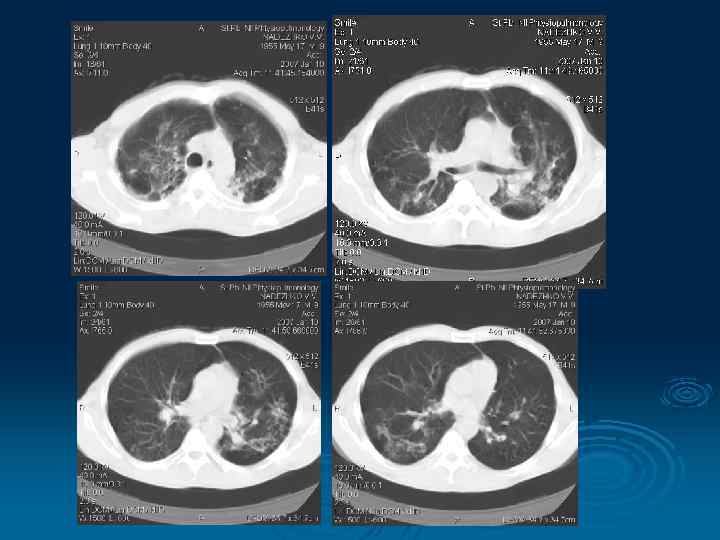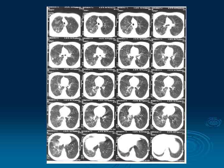 Облаковидный инфильтрат (24%) - поражение 2 -х сегментов - структура неоднородная, очаговая - деструкция – пневмониогенные каверны 75% -очаги различного типа воспаления - поражение мелких и хрящевых бронхов - участки ацинарного и долького апневматоза -интерстиций утолщен (септальный, перилобулярный, аксиальный по ходу дренирующих бронха) - возможно увеличение лимфоузлов