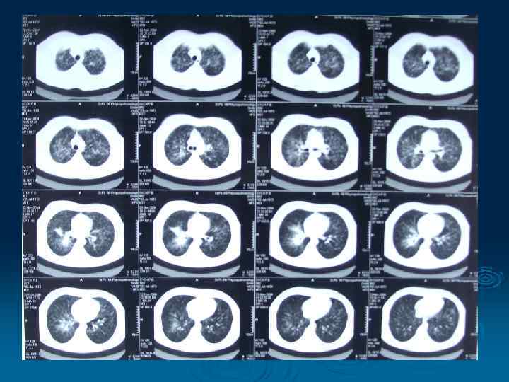 Дифференциальная диагностика Ø Ø Ø Ø Дифференциальная диагностика диссеминированного туберкулеза может представлять значительные трудности. Большое количество заболеваний и патологических состояний может иметь сходную клиническую и рентгенологическую картину. Однако наиболее частыми из них в практике фтизиатрических учреждений являются: • гематогенные метастазы; • лимфогенный карциноматоз; • саркоидоз; • пневмокониоз; • гистиоцитоз; • идиопатический фиброзирующий альвеолит; • экзогенные аллергические альвеолиты.