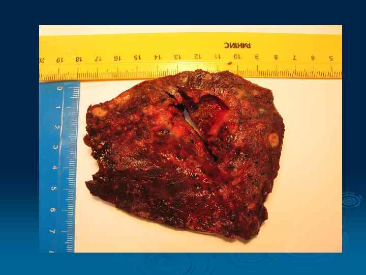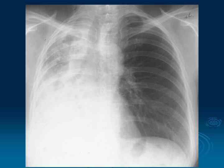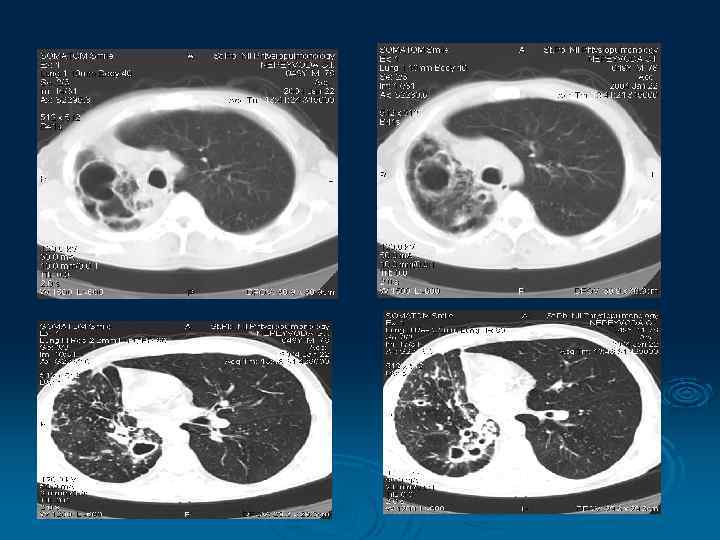 Хронический абсцесс Отличительными признаками хронического абсцесса являются: Ø наличие жидкости в полости деструкции Øтолстые стенки с нечеткими наружными контурами Øналичие рубцов, эмфизематозных полостей и бронхоэктазов в окружающей легочной ткани Øуменьшение объема пораженной части легкого ØОчаги отсева вокруг полости абсцесса отсутствуют.