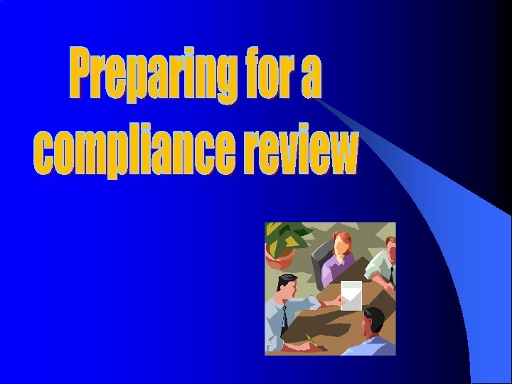 Logistics • Expect an on-site compliance review to last 3 to 5 days. • Review team will need a room in which to conduct interviews and review records. Room should include a table and chairs, and electrical outlets (to plug-in laptop computers).