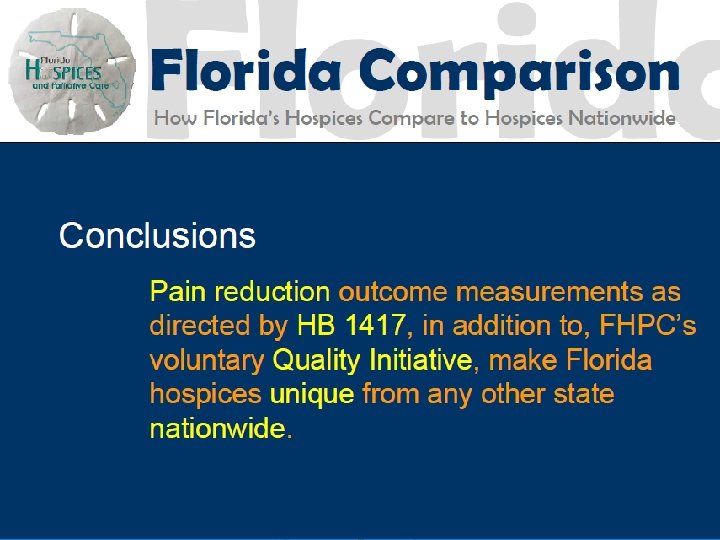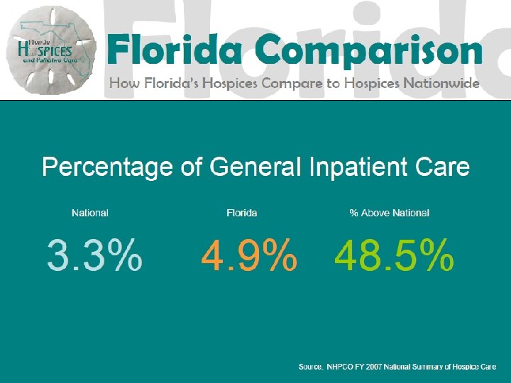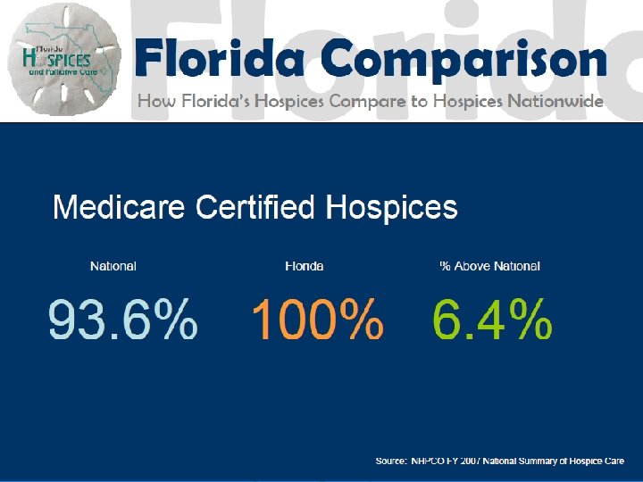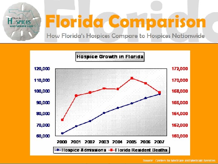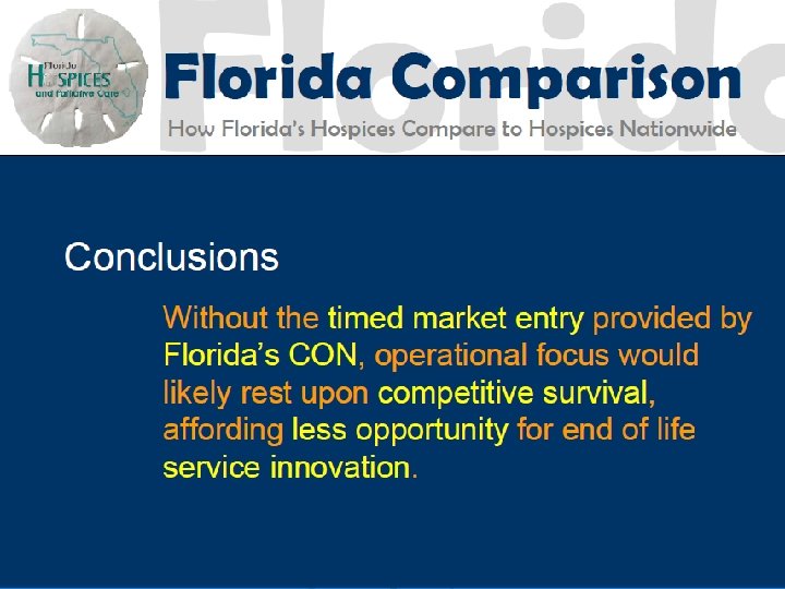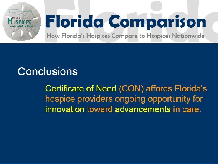 History of Hospice CON 1980 - Hospice became covered by Florida CON 1983 - (and repeatedly since) Legislature recommended repeal of CON for Hospice of the FL Suncoast 1990 - Agency began process to amend rule 1994 - Rule change enacted 2001 - Florida Certificate of Need Workgroup Report