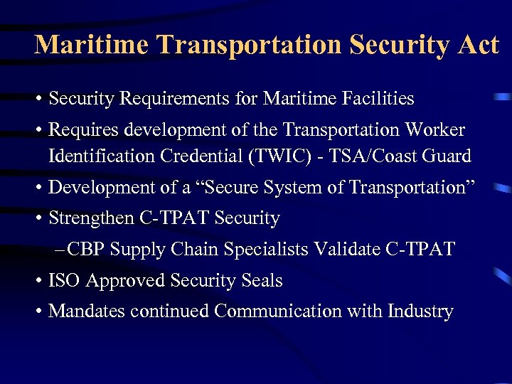 Maritime Transportation Security Act • Security Requirements for Maritime Facilities • Requires development of the Transportation Worker Identification Credential (TWIC) - TSA/Coast Guard • Development of a “Secure System of Transportation” • Strengthen C-TPAT Security – CBP Supply Chain Specialists Validate C-TPAT • ISO Approved Security Seals • Mandates continued Communication with Industry