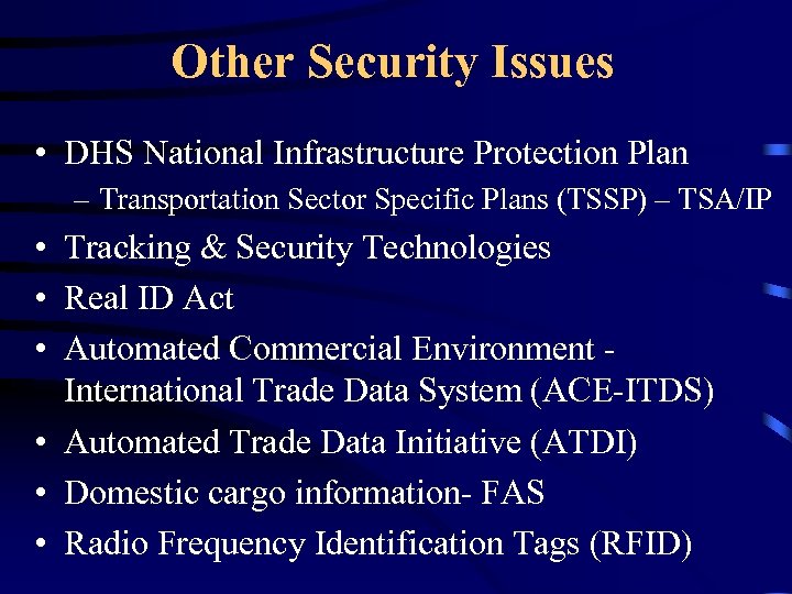 Other Security Issues • DHS National Infrastructure Protection Plan – Transportation Sector Specific Plans (TSSP) – TSA/IP • Tracking & Security Technologies • Real ID Act • Automated Commercial Environment International Trade Data System (ACE-ITDS) • Automated Trade Data Initiative (ATDI) • Domestic cargo information- FAS • Radio Frequency Identification Tags (RFID)