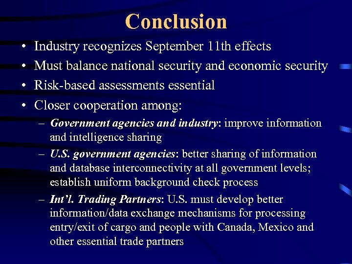 Conclusion • • Industry recognizes September 11 th effects Must balance national security and economic security Risk-based assessments essential Closer cooperation among: – Government agencies and industry: improve information and intelligence sharing – U. S. government agencies: better sharing of information and database interconnectivity at all government levels; establish uniform background check process – Int’l. Trading Partners: U. S. must develop better information/data exchange mechanisms for processing entry/exit of cargo and people with Canada, Mexico and other essential trade partners